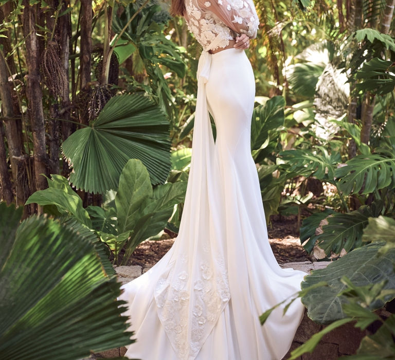 - Two-piece bodice embellished with 3-D lace lined with organza