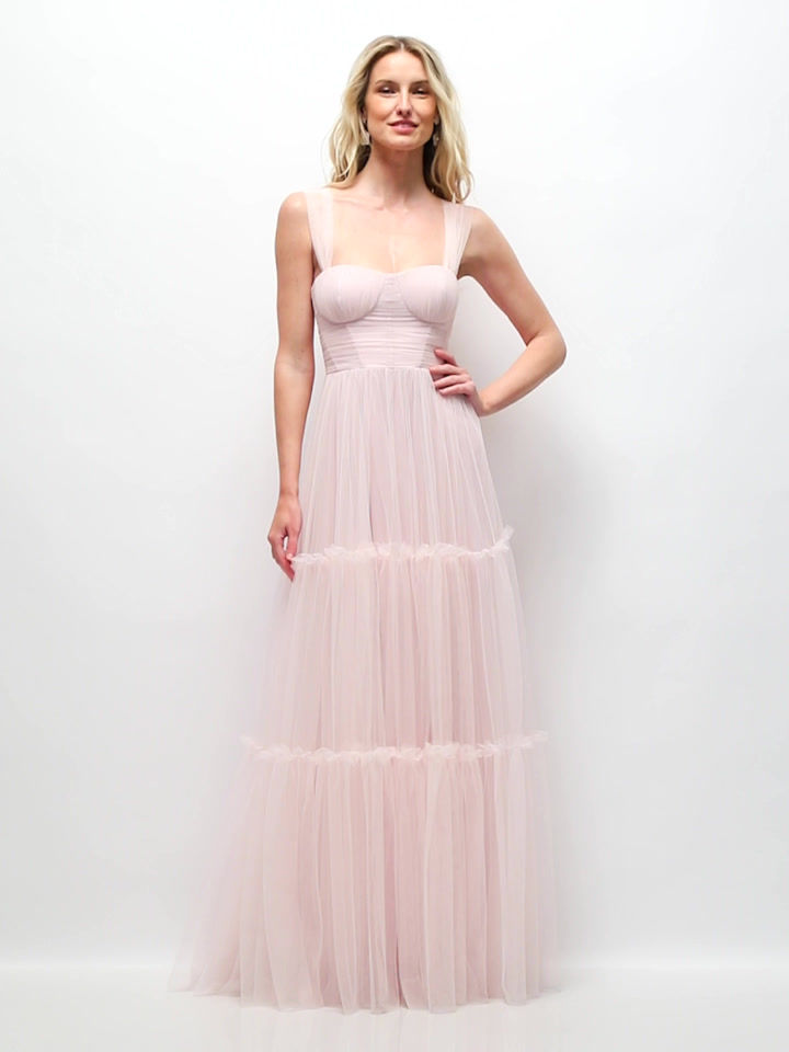 This dreamy Neu Tulle dress is your go-to for stealing the spotlight. With a chic, shirred overlay that flows across the bustier-style bodice, this alluring tiered maxi dress shows off your curves with exposed boning that adds an edgy vibe. The natural waist transitions seamlessly into a dreamy, full-tiered skirt that sways with every step, making you feel confident and carefree. The wide tulle sash tie straps give you styling freedom—whether you're going for a sultry halter look or prefer the effortless look of straight straps, it's all about making you feel unstoppable.