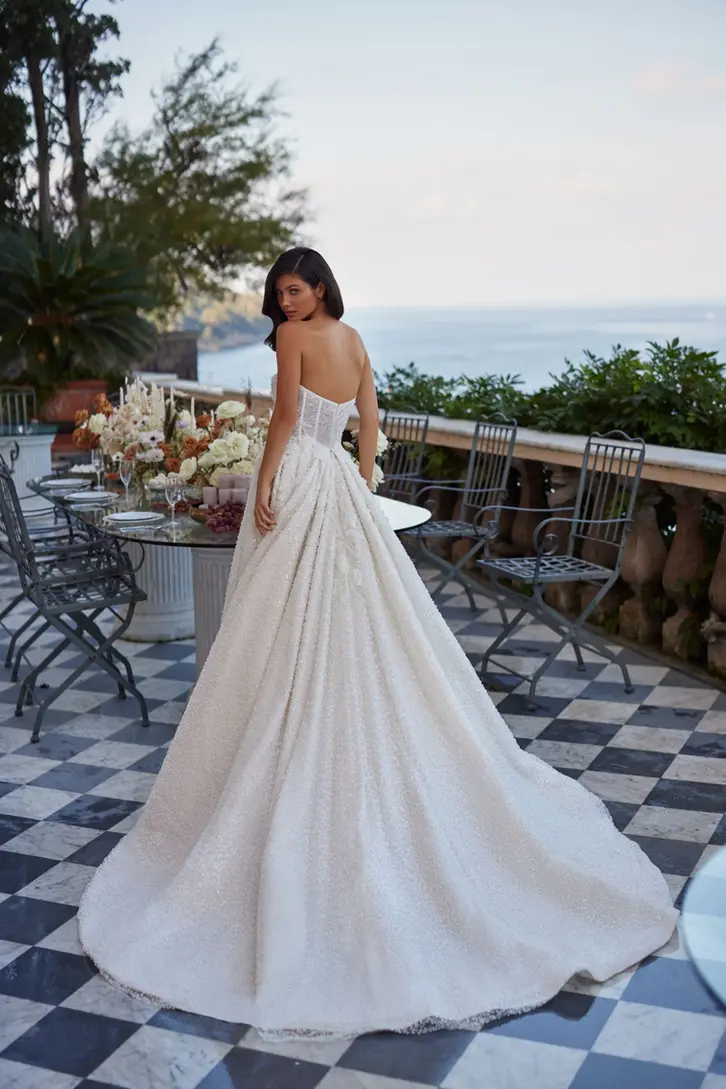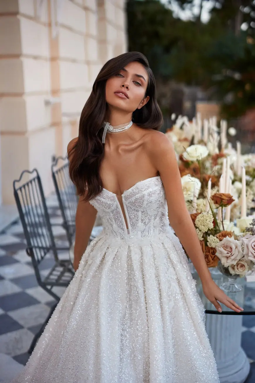 This gown showcases a beautifully beaded skirt that adds texture and subtle sparkle. The fitted bodice transitions smoothly to the flowing skirt, offering a refined and romantic modern look.