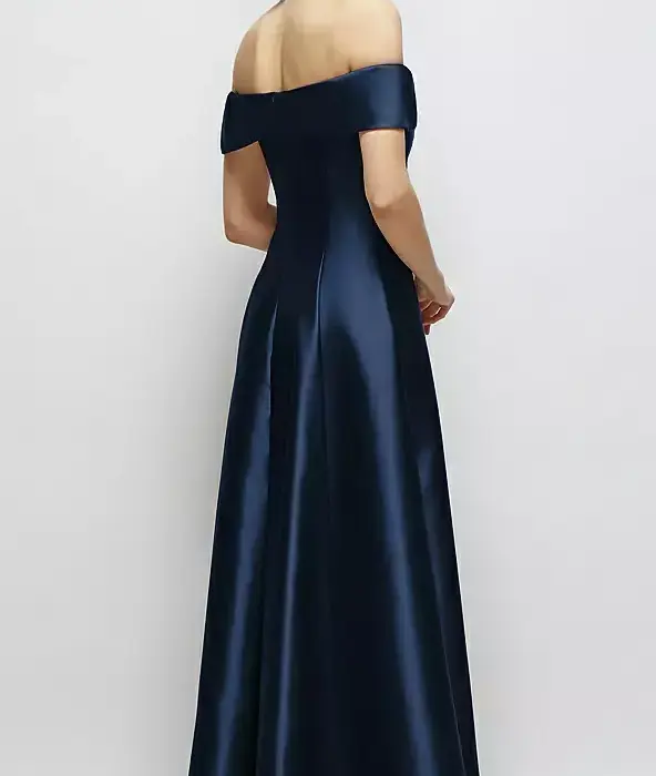 This romantic off-the-shoulder maxi gown features a bold asymmetrical bow cuff that elevates its classic silhouette. Crafted from radiant satin twill, it flows into a full ballroom skirt perfect for the dance floor.