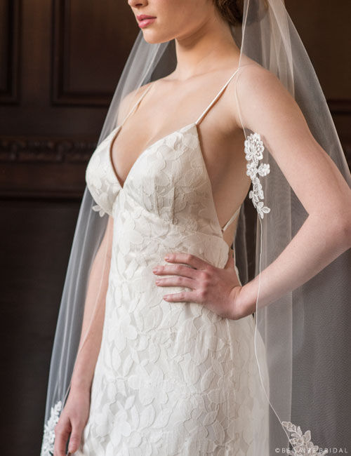 Transform your bridal ensemble with flawless, feminine beauty. Romantic Alençon lace flowers grace an ethereal 1-tier waltz length veil with a light rolled edge.