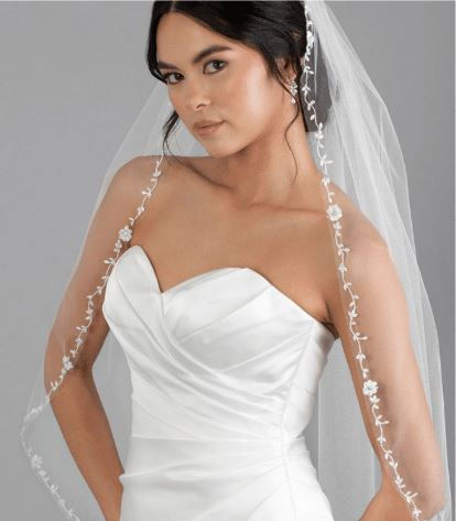 1 -tier fingertip veil with embroidered vine edge accented with frosted paillette flowers and leaves