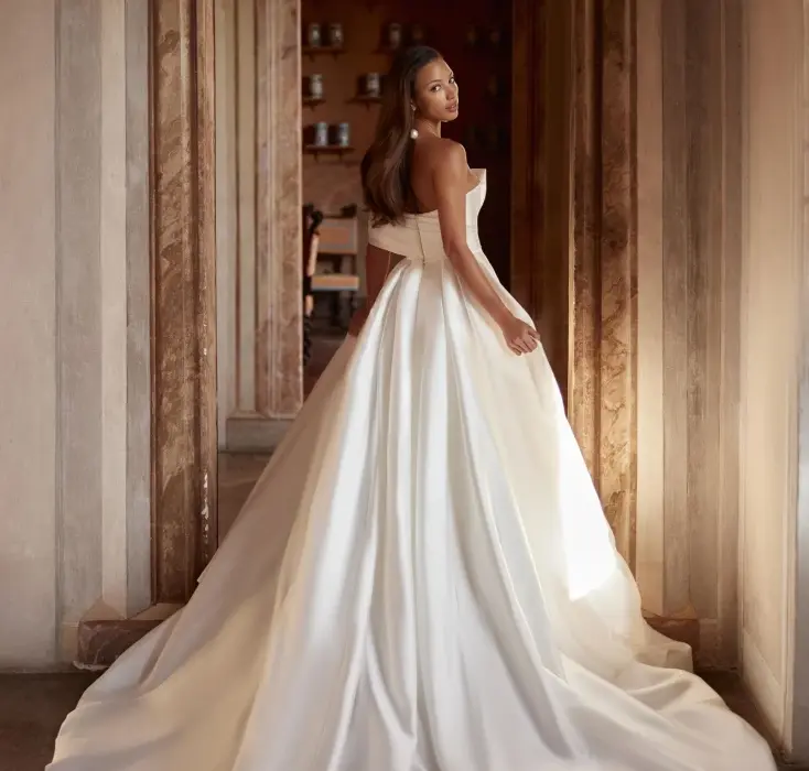 Description: This elegant, puffed dress is made of Mikado fabric in ivory color. This royal look will successfully emphasize the bride's refined taste, her preference for minimalism and restrained luxury in details. The bodice of the dress is of an even shape, with a thin belt and starting from the right side seam with asymmetrical drapery that imitates a bow and smoothly passes into the sleeve on the left. The back has a slightly concave drapery below the shoulder blade line. The top is fastened with hooks and eyelets. A puffed skirt has a luxurious royal train and large pleats. The skirt is fastened with a hidden zipper. This dress is a perfect wedding look for a genuine lady.
