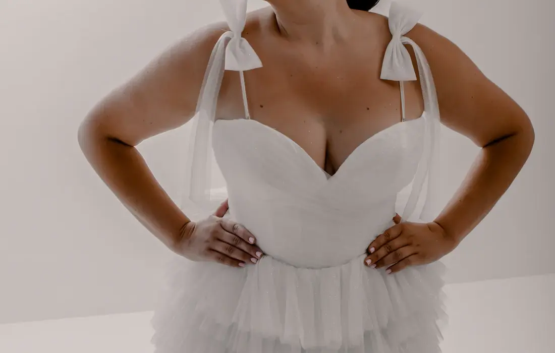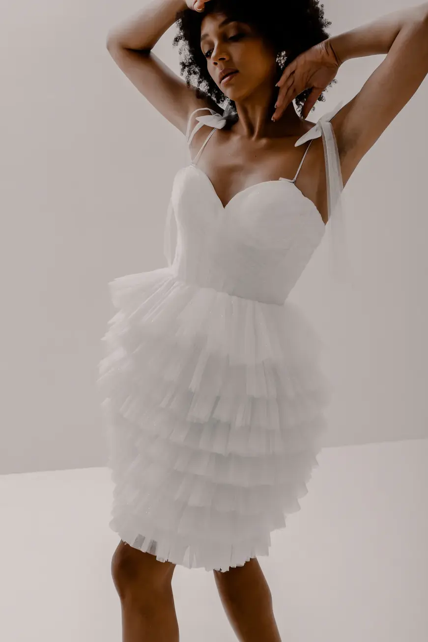 Description: Features bow sleeves, exposed boning on the bodice with draped glitter tulle, and a skirt made of short glitter tulle ruffles.