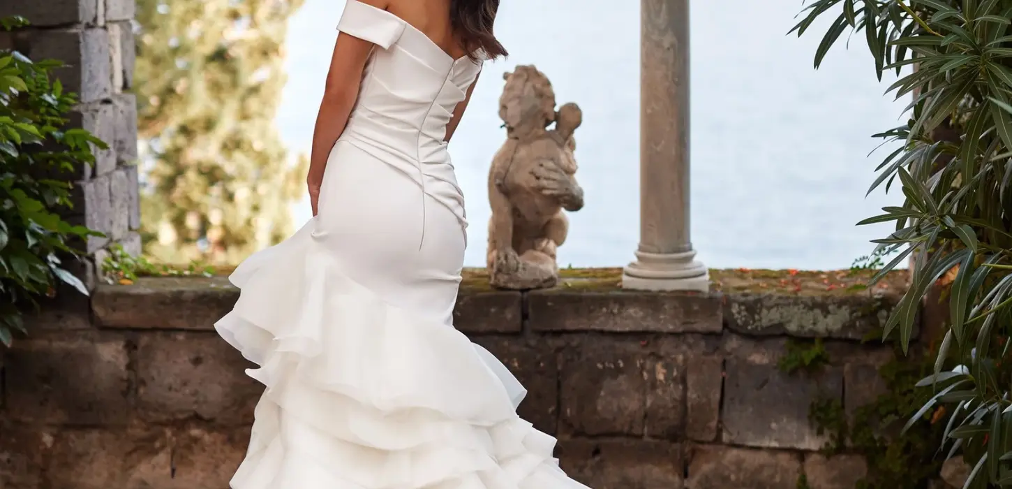 The bride in a mermaid silhouette dress in ivory color, made of costume fabric with a lush train, will charm everyone with a graceful posture. The top of the dress has a slightly concave neckline in front and short sleeves on the forearm. The back is concave below the shoulder blade line. It is an original design solution to decorate the laconic top of the dress with diagonal pleats of the main fabric. The puffy bottom of the dress, starting above the knee level, is decorated with voluminous asymmetric organza ruffles. The clasp of the dress is a hidden zipper.
