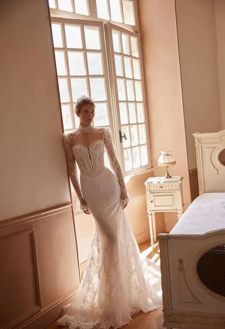 An exquisite mermaid silhouette gown in delicate ivory color that combines the lightness of lace and the noble sparkle of milky satin. The corset with molded sweetheart cups is created from lace and milky sparkle, complemented by a sheer draped high-neck top made of lace. The corset is decorated with decorative satin ribbons and hand embroidery with crystal that plays in the light, giving the gown unique charm. The top is decorated with lace appliqués that delicately conceal the attachment lines of long, semi-sheer, voluminous lace sleeves. The sleeve edges are adorned with light ruffles that emphasize the romanticism of the look.