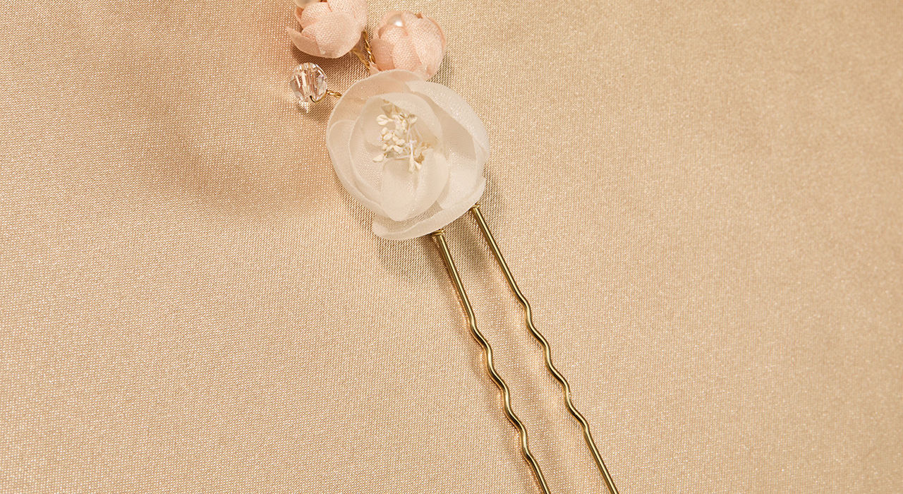 Description: Rhodium plated fabric flower hairpin with crystal and pearl bead accents