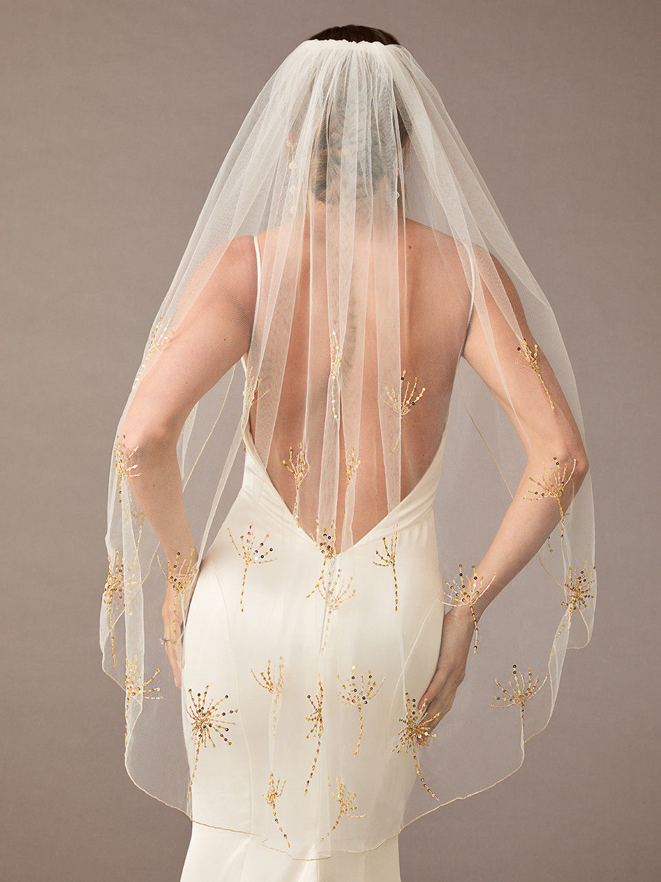 Description: English tulle veil with gold embroidered and sequin dandelion design and unfinished edge