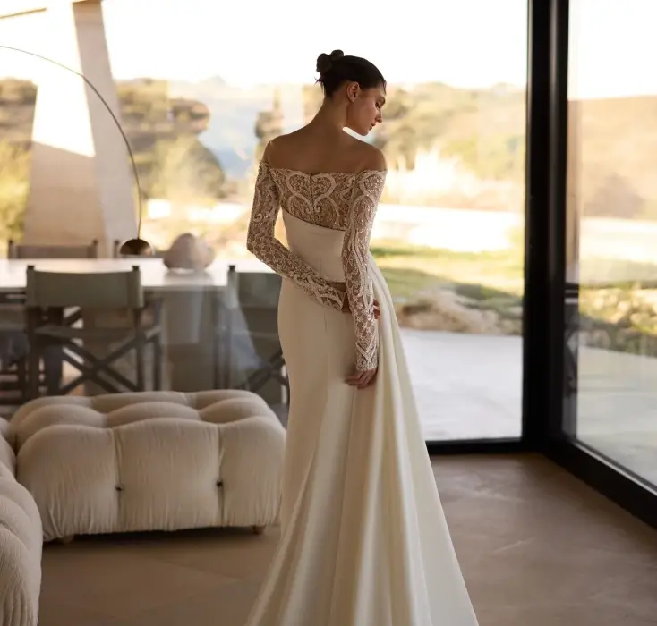 Description: This elegant fishtail dress in ivory color has a touch of seduction. The corset of the dress is semi-transparent, made with a deep V-neck. On top of the corset is sewn a tank top made of luxurious embroidered lace and a boat neck, which smoothly passes to the forearms into long fitted sleeves. The back is concave, made of lace with a loop and button closure.