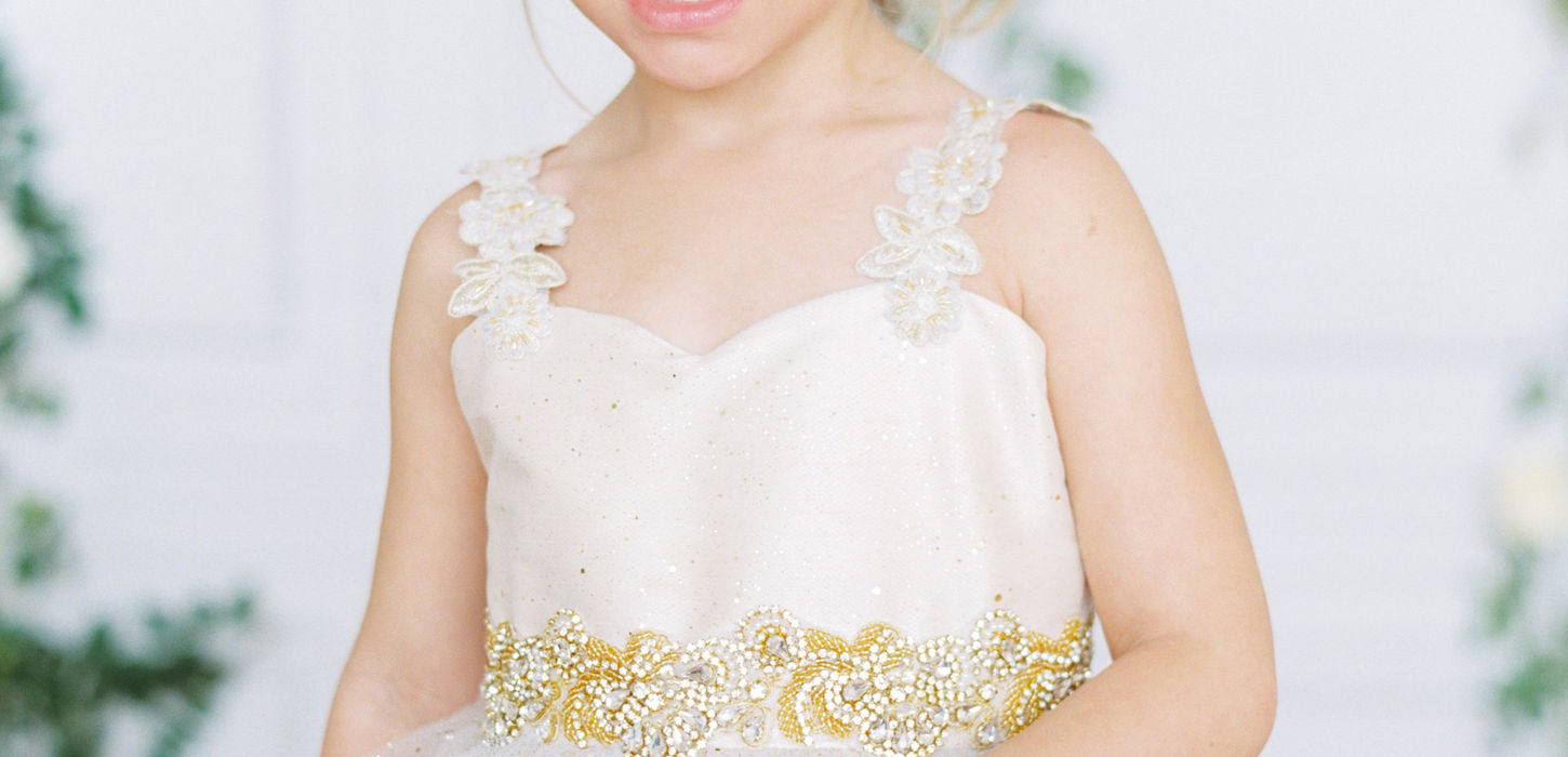Description: Heavy sparkle tulle over dupioni and heavy sparkle mini skirt floral straps and sparkle belt.