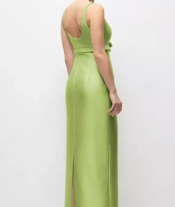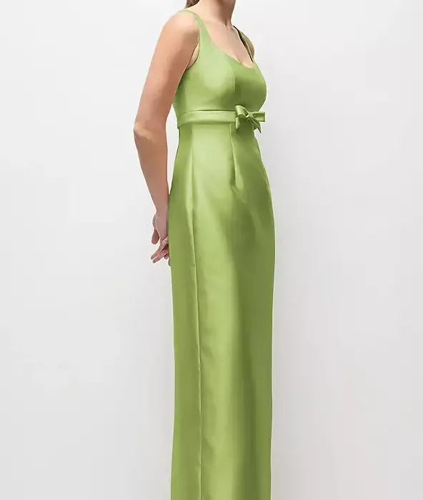 This satin twill maxi dress captures sleek sophistication with a vintage nod. Designed with a soft scoop neckline and empire waist, it elongates the silhouette for an effortlessly chic look. The bow detail at the center front adds a feminine spark. Finished with a clean column skirt and center back slit, this satin maxi dress blends timeless polish with a modern edge.