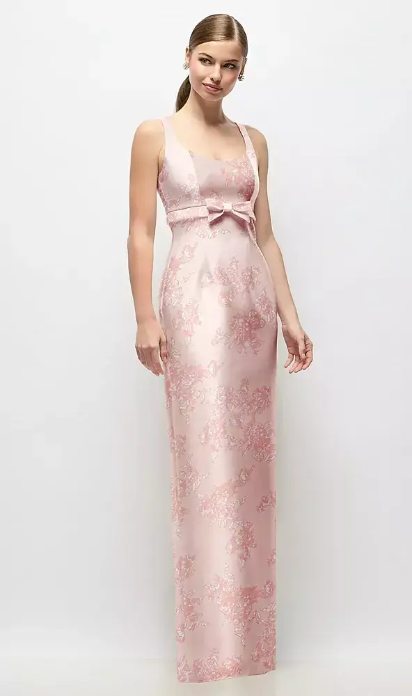 This floral satin maxi dress brings a fresh, romantic twist to sleek simplicity. The scoop neckline and empire waist create a flattering silhouette, complete with a tailored, feminine bow at the front waistband. The smooth floor-length column skirt features a center-back slit for freedom of movement. Crafted in a luminous, flowered satin twill, this floral dress blends clean, modern lines with a vintage-inspired charm that feels both effortless and unforgettable.