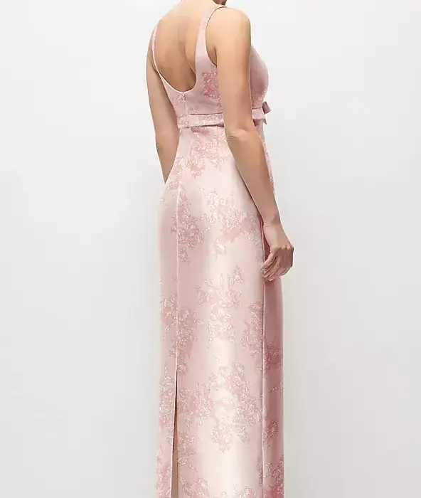 The floor-length column skirt includes a center-back slit to provide ease of movement. Made in a luminous floral satin twill, the gown blends clean, modern lines with timeless charm, fully lined for comfort.