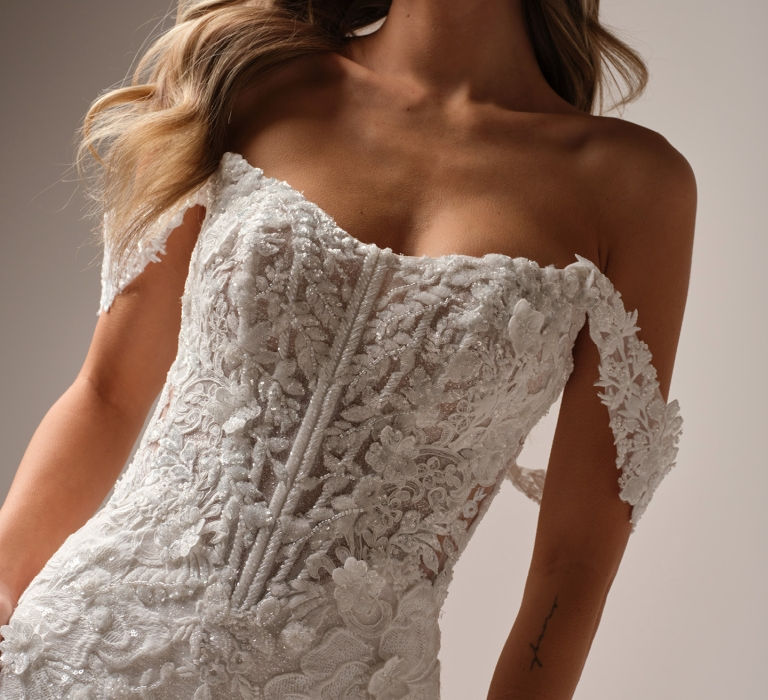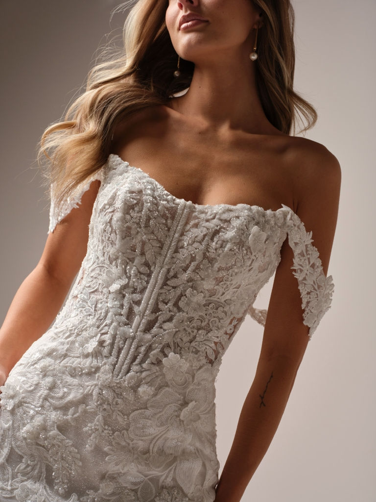 - Detachable off-the-shoulder illusion beaded and sequin lace cap-sleeves
