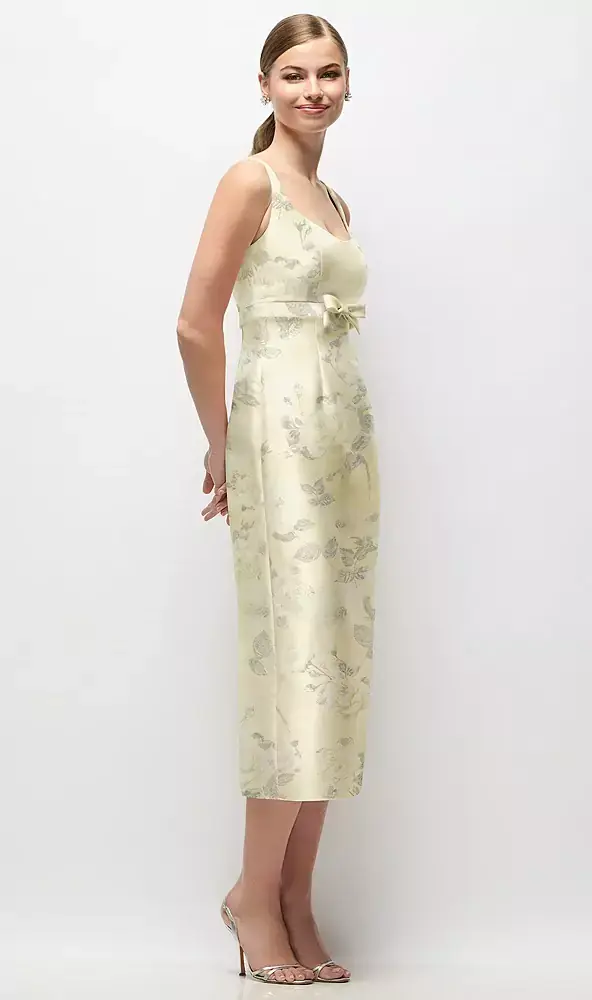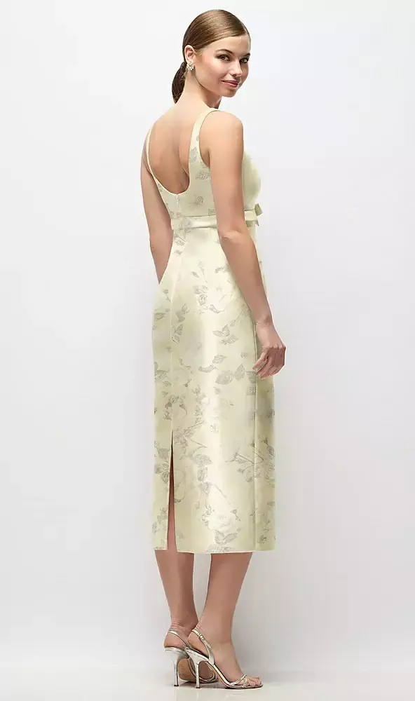 Tea length Satin Twill floral empire waist column dress with scoop neckline. Bow detail at center front empire waistband.