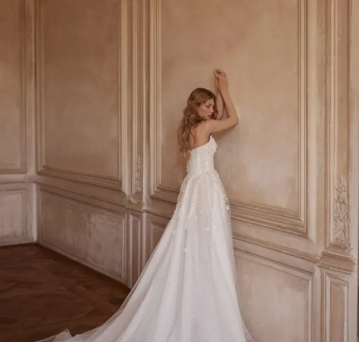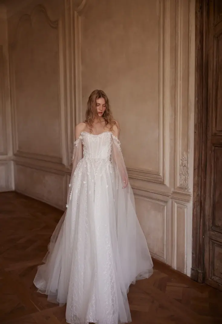 An elegant A-line gown in ivory color with an exquisite corset and voluminous skirt. The corset with a refined boat neckline has a curved back that drops below the shoulder blade level, emphasizing the refinement of the silhouette. It is decorated with vertical draping of delicate Euro mesh, complemented by lace appliqués with 3D effect and delicate hand embroidery with crystal. The corset closure is hook-and-eye extenders. The voluminous skirt with train creates an impressive look, with the upper layer decorated with appliqués that smoothly descend from the corset. The closure is located at the center back panel in the form of a hidden zipper. The gown is also available in light skin color and with lining in the skirt for additional comfort. A bolero-train can be added to the look, adding solemnity and completeness.