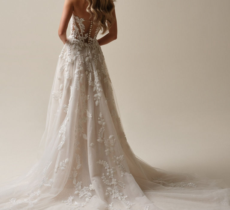 - Illusion bodice with exposed boning detail and asymmetrical beaded and sequin lace motifs