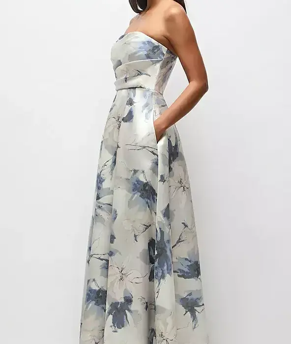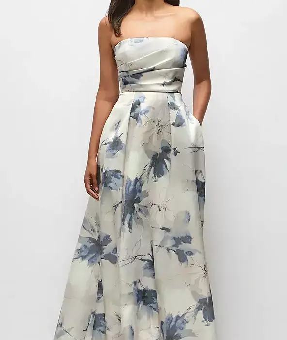 This floral satin maxi dress delivers a storybook vibe with a fresh edge. The strapless bodice is hand-pleated for a sculpted, flattering shape, while the full pleated skirt moves with effortless sweep and grace. Hidden side pockets add unexpected practicality, making this gown as chic as it is wearable. With its petal-printed satin twill fabric, this floral dress transforms into an unforgettably romantic statement piece.
