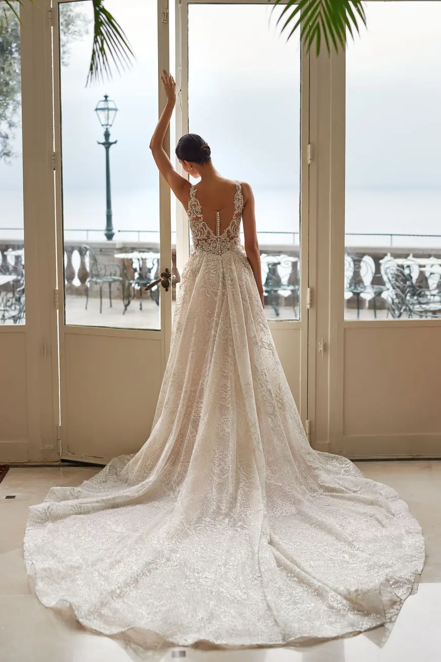 You can get into the world of wealth and shining luxury just by wearing an A-line dress in light skin color. The owner of the dress will proudly step at the wedding ceremony, knowing about her perfect look. The semi-transparent top with a V-neck down to the waistline is decorated with embroidered appliqués that smoothly transition to the straps. The sides of the top are made of nude-colored mesh, which gives the effect of nudity. The back of the corset with a V-neck is elegantly decorated with embroidered patterns of appliqués that emphasize the neckline, the clasp in the center of the back on the loop and button has the look of a decoration. A slightly voluminous skirt has a luxurious train, the top layer of which is made of textured gloss and decorated with embroidered appliqués that smoothly pass from the corset. The skirt is fastened in the center of the back panel with a hidden zipper. It is also possible to make a dress in ivory color.
