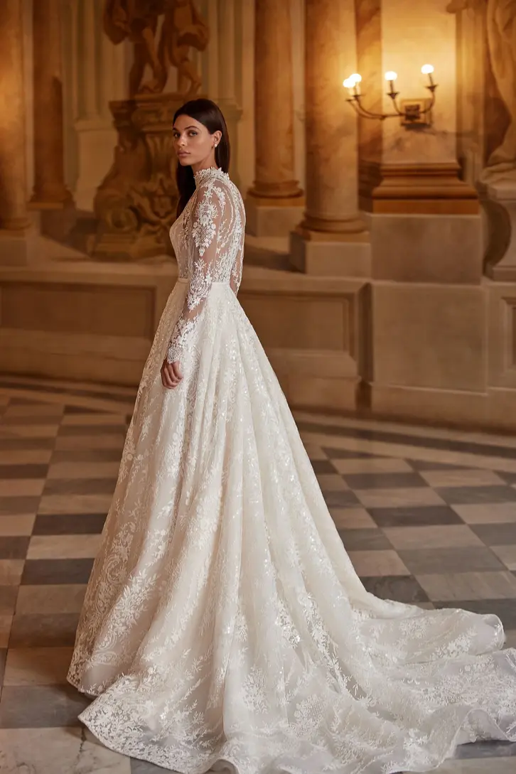 This bridal gown features a romantic silhouette enhanced by the artistry of sheer floral lace that extends seamlessly across the bodice and sleeves. The refined lacework adds texture and depth, creating a sophisticated yet timeless bridal look.