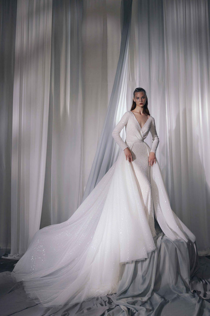 This elegant overskirt gracefully drapes over a beaded long-sleeve bridal gown, adding dimension and a touch of shimmer to your ensemble. Its delicate construction enhances the gown beneath, creating a stunning layered silhouette.