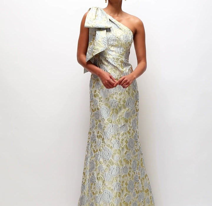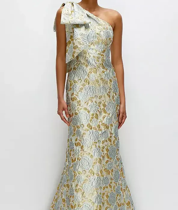 This luxe gold leaf brocade one-shoulder dress epitomizes timeless glam. The opulent woven floral pattern with a soft white or pale blue backdrop makes the shimmering gold accents pop, catching the light with every move. The oversized bow at the shoulder adds a chic vibe to this lush design, while the soft trumpet skirt flows effortlessly into a slight sweep train with a 1-inch horsehair hem for a polished edge. This rich gold leaf floral maxi dress is next-level luxury, making you feel like pure royalty at any event.