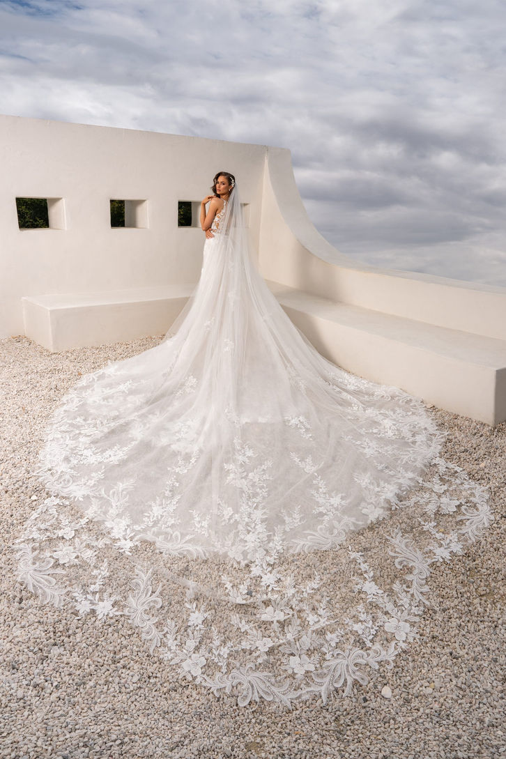 This bridal gown features an elegant long sheer train that enhances its graceful, modern design. The delicate floral lace adds subtle texture and romantic charm, perfect for a bride seeking timeless sophistication.