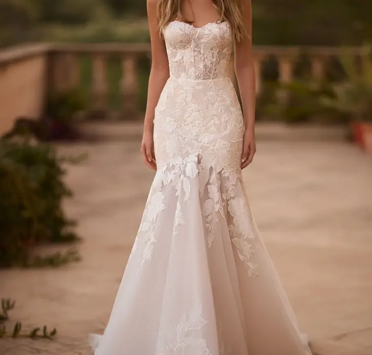 Description: If the bride wants to look romantic and seductive, then she should wear a fishtail dress in lightskin color, which will also allow her to move easily and quickly during a walk or dance. This wedding gown is exactly the perfect option. The corset of the dress is semi-transparent, with a romantic sweetheart cutout on the front and a concave back. The corset is decorated with voluminous lace patterns of flowers and petals. The lace skirt is fitted in the hip area and has a slit at the bottom of the skirt in the center, which exposes the legs only during movement. The skirt is fastened in the center of the back panel with a hidden zipper. This dress is also available in ivory color.