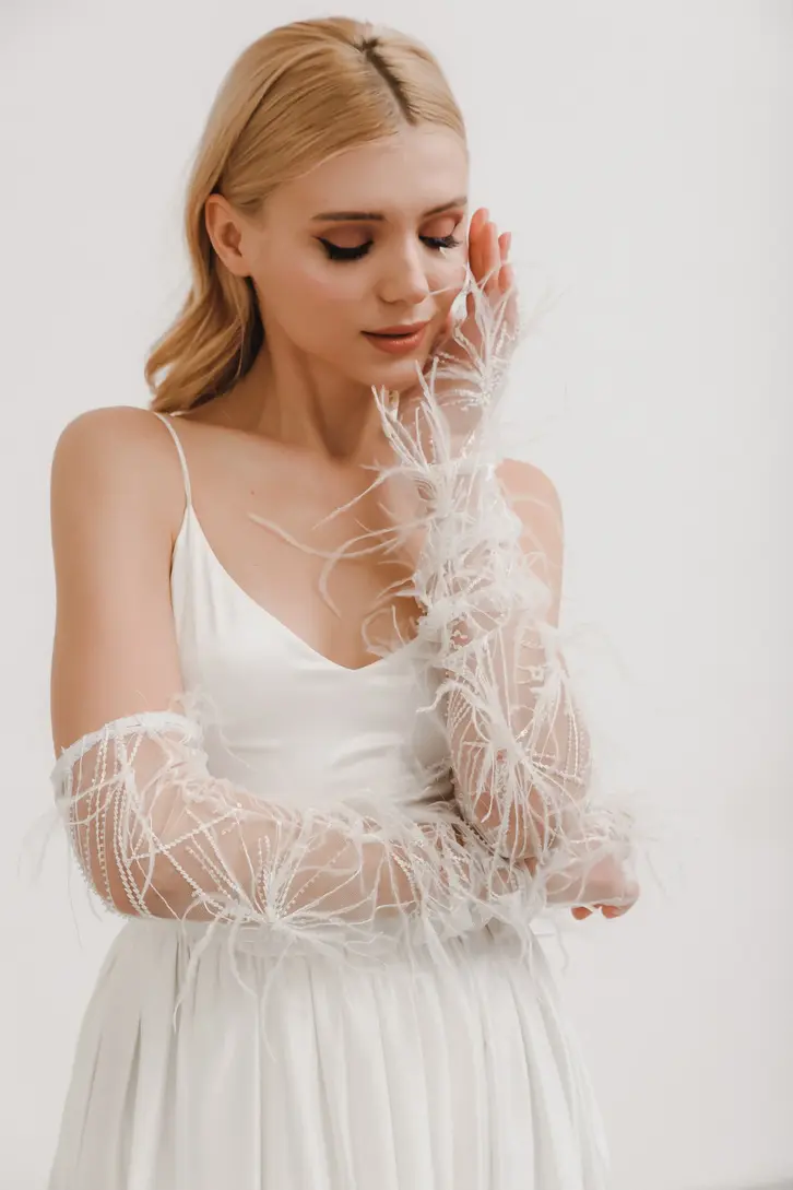 These sheer gloves feature delicate feather and bead embellishments, adding a touch of ethereal elegance to your wedding day look. Designed to complement a variety of gown styles, they offer a refined finish with their intricate details.