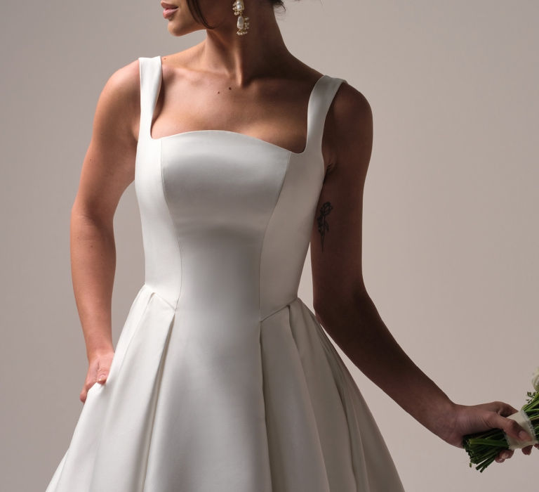 - Opt to shorten the train (up to 24 in/61 cm) or remove the train for a more casual look through special request