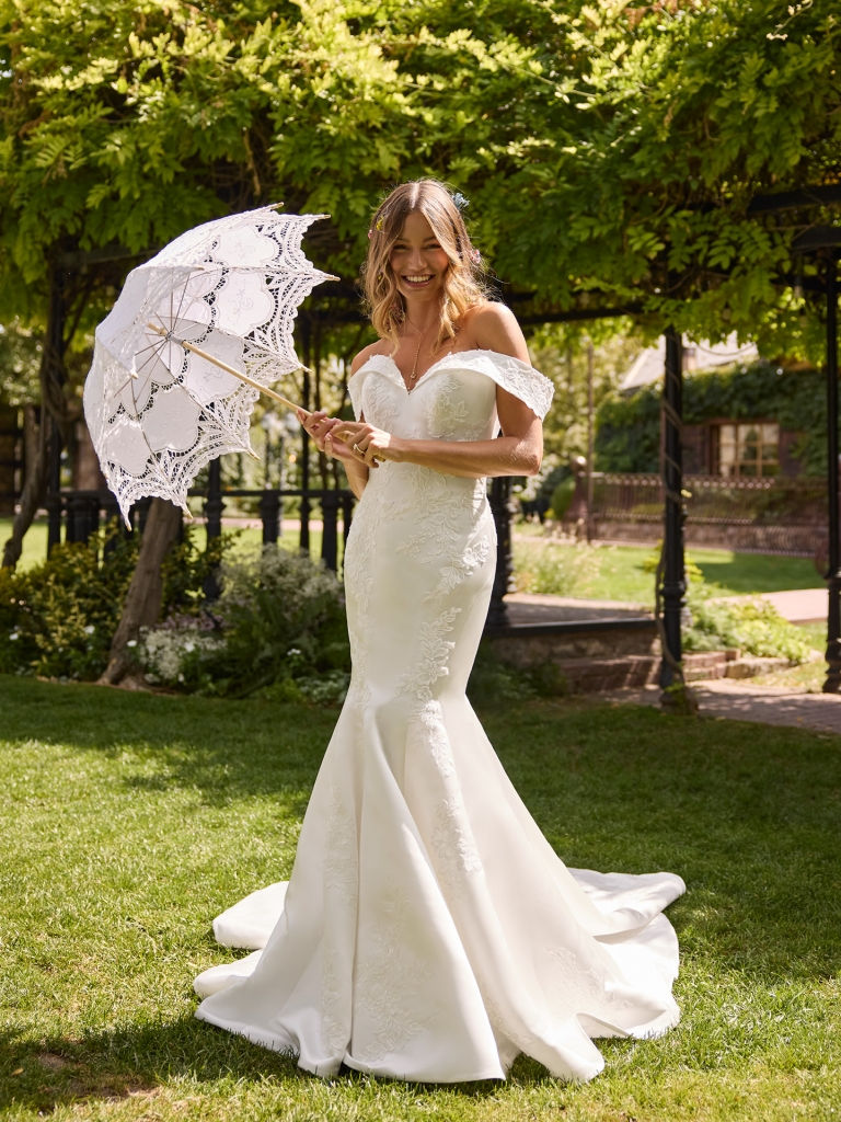 Miley flattering off-the-shoulder sequined lace accents fit-and-flare wedding dress