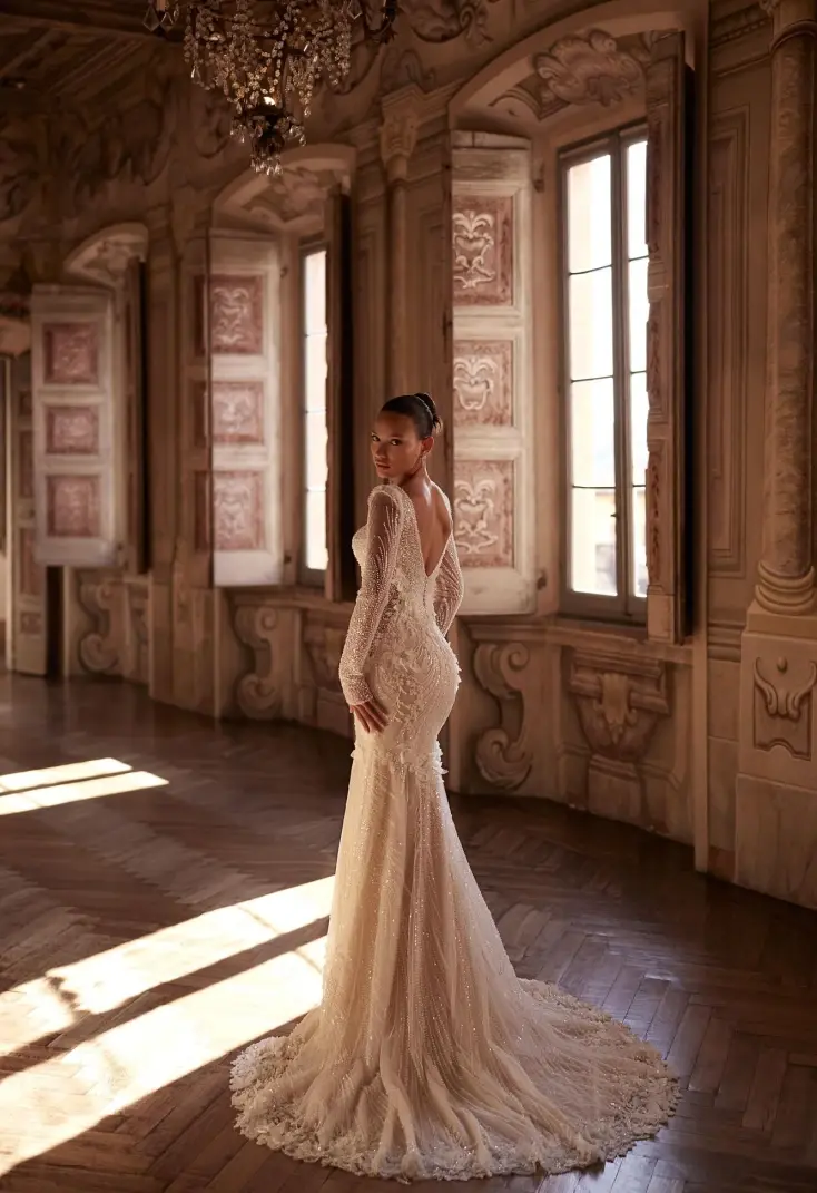 This gown gracefully contours the body, combining elegant long sleeves with a plunging neckline for a modern yet timeless bridal look. The intricate textured details enhance the dress's refined design, perfect for a sophisticated bride.