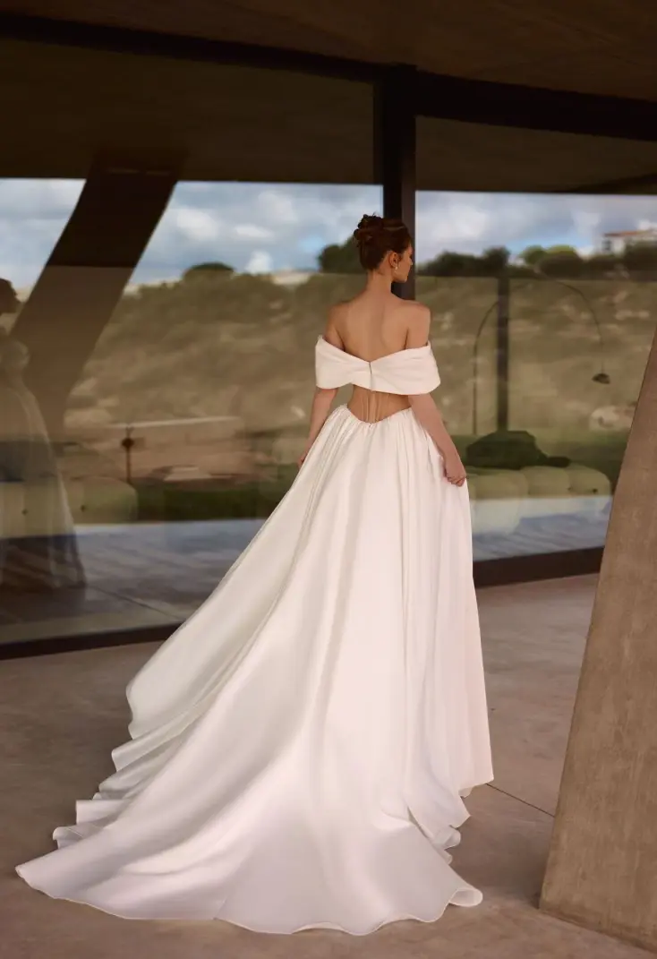 This gown beautifully balances modern design with romantic elegance. The off-shoulder bodice drapes gracefully, creating a refined silhouette that flatters the neckline and shoulders. The full skirt adds movement and drama, while the innovative cutout sides introduce a subtle edge to the classic bridal shape.