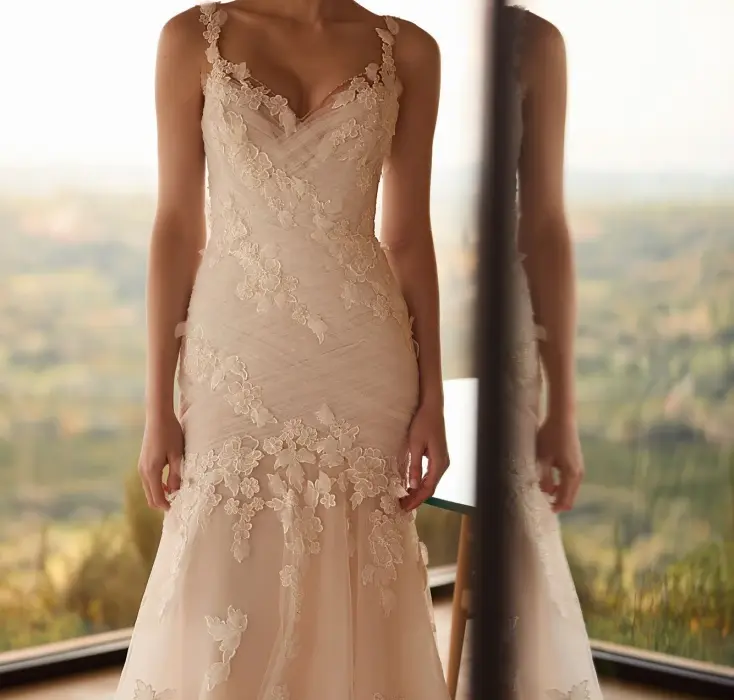 Description: A classic mermaid dress in lightskin color with an unusual design will emphasize the bride's graceful posture and seductive figure. The semi-transparent dress is made with a sweetheart neckline that turns into straps. The back is V-shaped, above the waistline. Corset and the fitting part of the skirt are decorated with a delicate mesh drapery, as well as asymmetrical floral appliqués with 3D effect. The puffy part of the dress is semi-transparent, made of tulle and decorated with asymmetric appliqués with 3D effect.