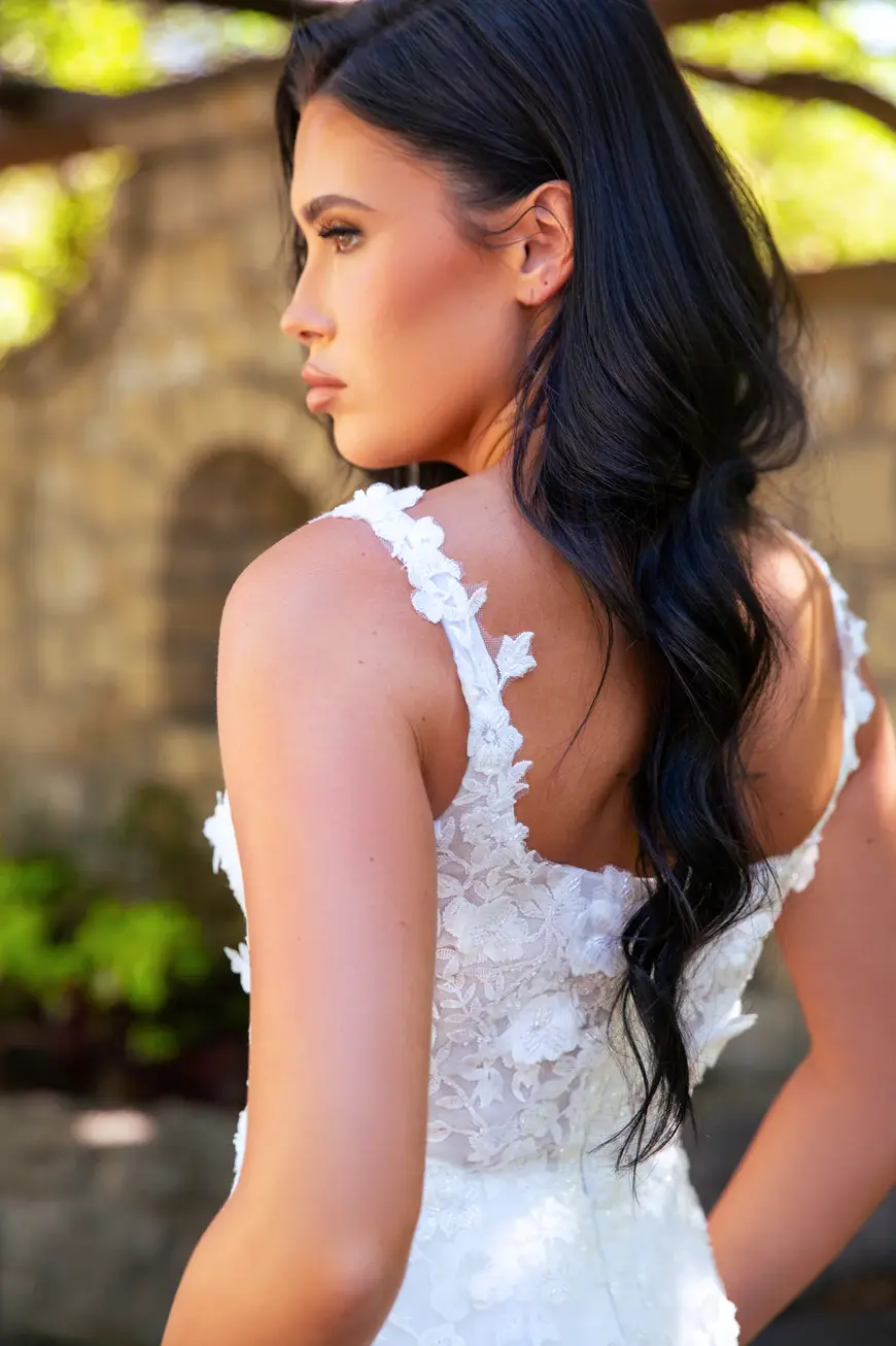 Description: A square neckline, birdcage skirt, and boning in the bodice makes this dress very flattering for all body shapes and sizes. She is adorned with beaded 3D floral lace.