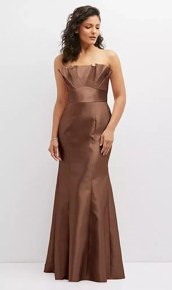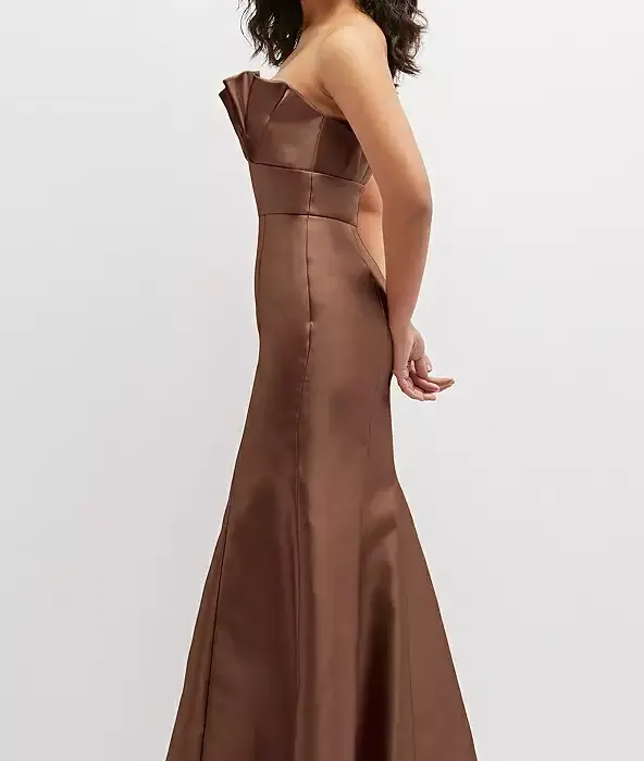 The glam look of a crumb-catcher bodice stands out in a Satin Twill gown offering beautiful symmetry. This fit-and-flare dress features a shaped inset midriff, a flattering look full of femininity.