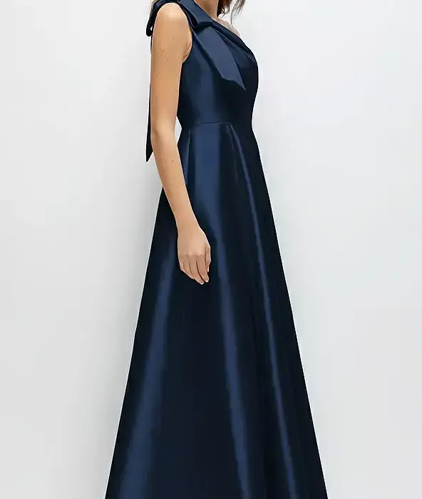 This satin dress offers a modern twist on the classic ballgown with its asymmetrical design and oversized shoulder bow. Crafted from satin twill fabric, it reflects light beautifully with every movement while the full skirt adds graceful volume and flow.