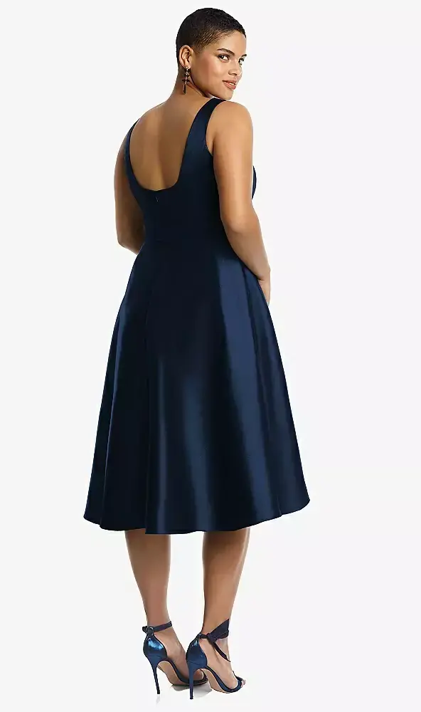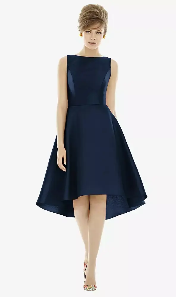 A modified high-low circle skirt sways softly for an entrancing silhouette. Classically lovely, the bateau neckline and scoop back of this cocktail length sleeveless satin twill dress shimmers and shines on or off the dance floor.
