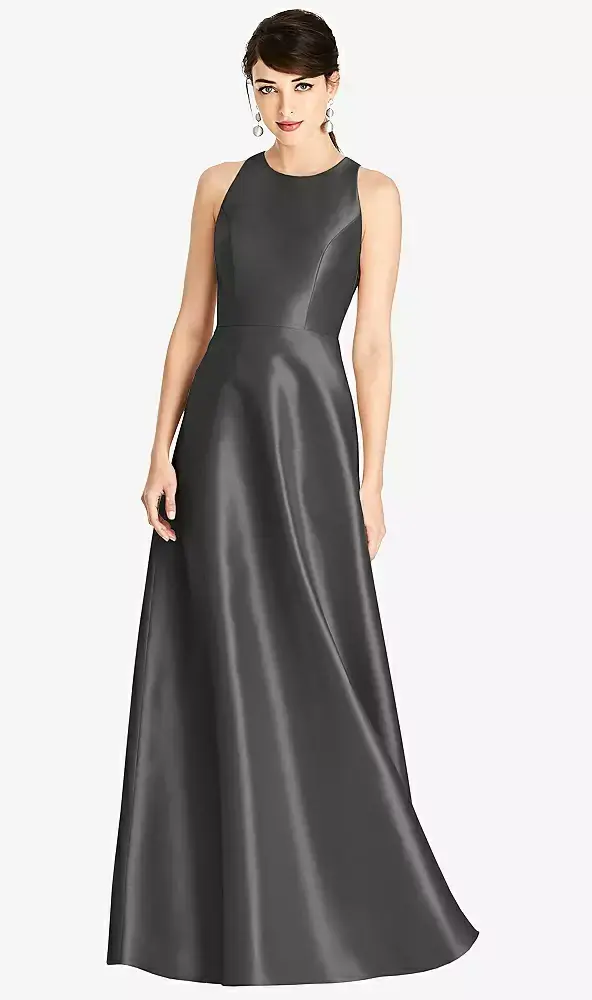 A classically times jewel neckline is spectacularly highlighted by the cutout diamond open back. The chic A-line skirt flows gracefully while the side seam pockets add a touch of delight to this full-length sleeveless satin twill dress.