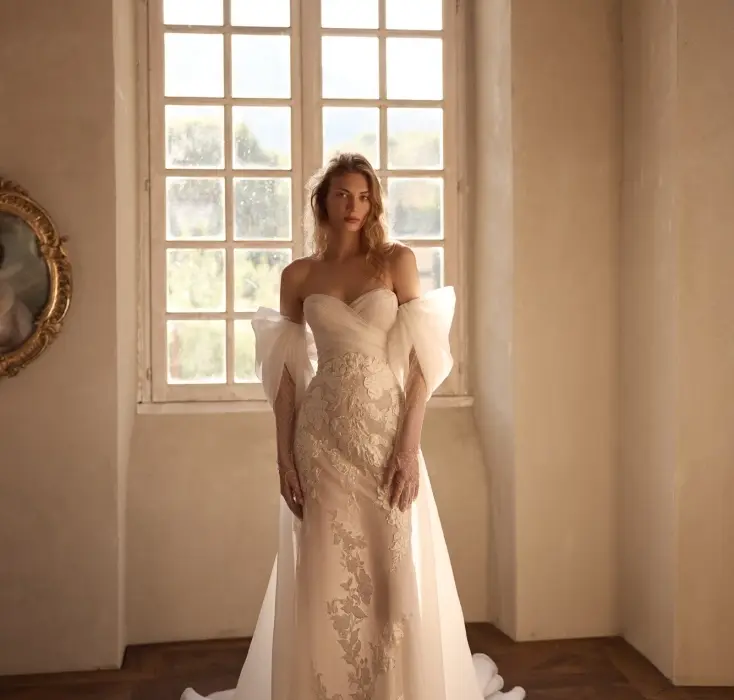 A mermaid silhouette gown in ivory – an elegant combination of elegance, lightness, and modern sensuality. The semi-sheer corset with a sweetheart neckline gently emphasizes the décolletage line. Draping of light organza envelops the bodice, creating a sense of airiness, while exquisite lace appliqués descending from the corset train onto the skirt create a smooth, harmonious transition. The corset back fastens with hook-and-eye extenders, maintaining perfect fit and refinement from any angle.