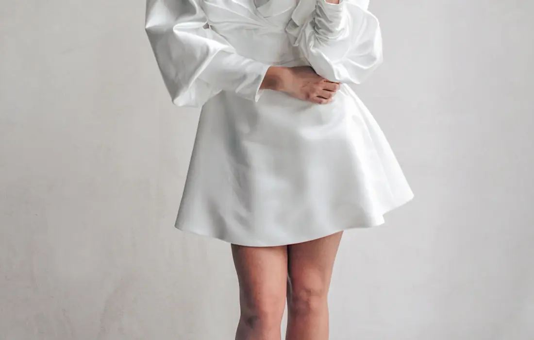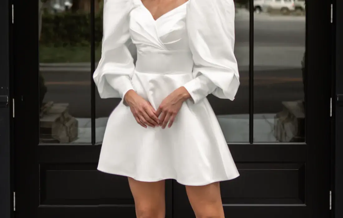 Description: Mikado beauty that features modern puff sleeves and a dramatic neckline.
